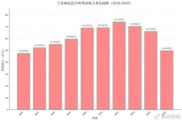 据国家统计局数据,2025年1-10月全国餐饮收入累计增长3.3%,商超渠道速冻食品品类同比增长5%,而三全食品作为行业第一梯队企业,未能借助行业回暖实现营收反弹,反而持续跑输行业均值。