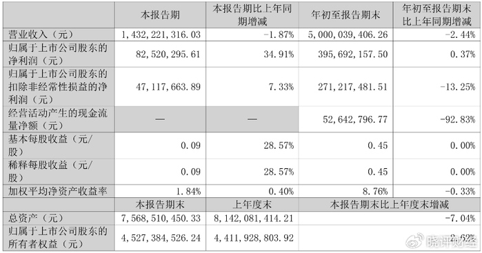 而且,前三季度,公司经营活动的现金流量净额,相比上年同期的7.34亿元减少了约6.81亿元,同比下降92.8%。