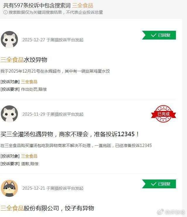 另外,食品安全问题的频发,进一步侵蚀品牌价值。搜索黑猫投诉[下载黑猫投诉客户端]平台,目前已有597条投诉,主要集中在速冻水饺含异物、汤圆馅料变质和包装破损等问题。