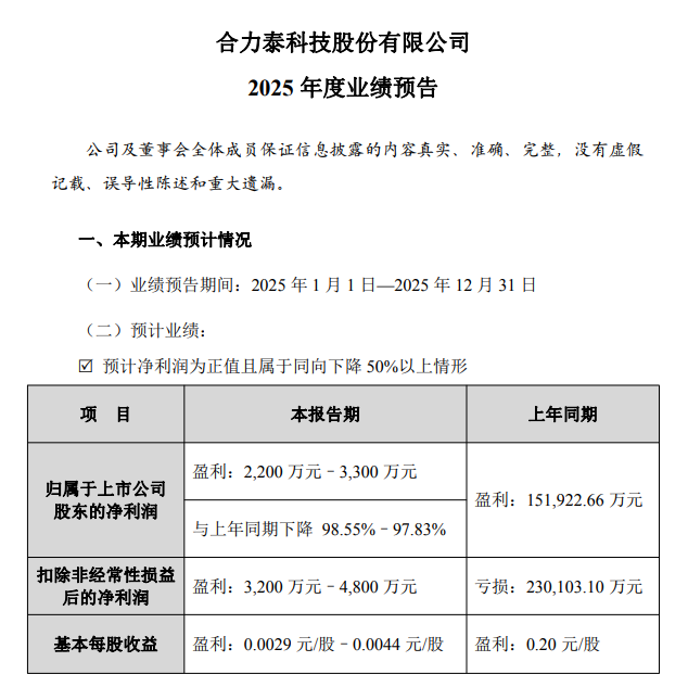 1月21日,合力泰发布2025年度业绩预告,公告显示,合力泰预计2025年归母净利润为2200万元–3300万元,同比下降98.55%–97.83%。