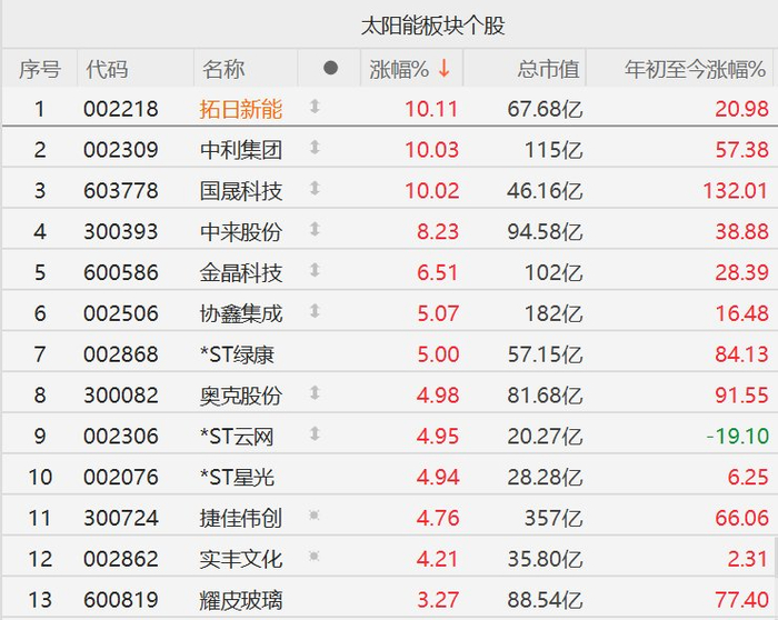 格隆汇11月12日|A股市场部分光伏股走强,其中,拓日新能、中利集团、国晟科技涨停,中来股份涨超8%,金晶科技涨超6%,协鑫集成涨超5%,奥克股份、捷佳伟创涨超4%。消息面上,媒体从中国科学院半导体研究所获悉,该所游经碧研究员领导的科研团队近期研制出光电转换效率为27.2%的钙钛矿太阳能电池原型器件。相关成果近日在国际学术期刊《科学》发表。