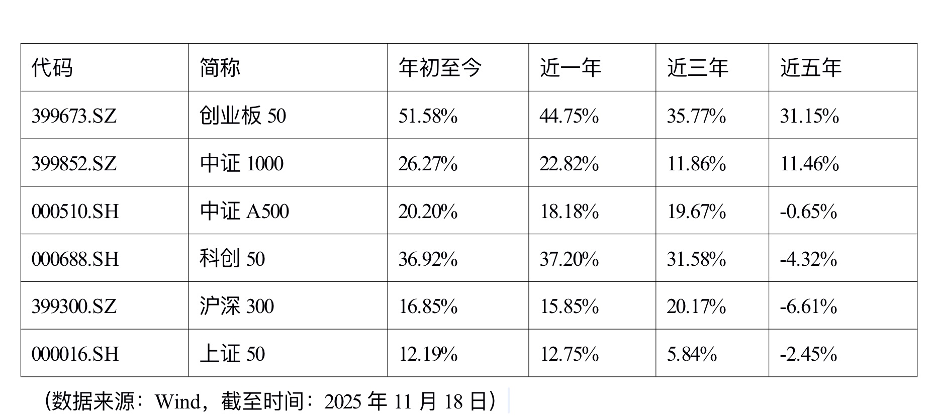 实际表现来看,创50指数年内涨幅领先。截至11月18日,创50指数累计涨幅为56.49%,高于其他宽基指数同期涨幅,同时在近一年、近三年、近五年维度中均有优势。