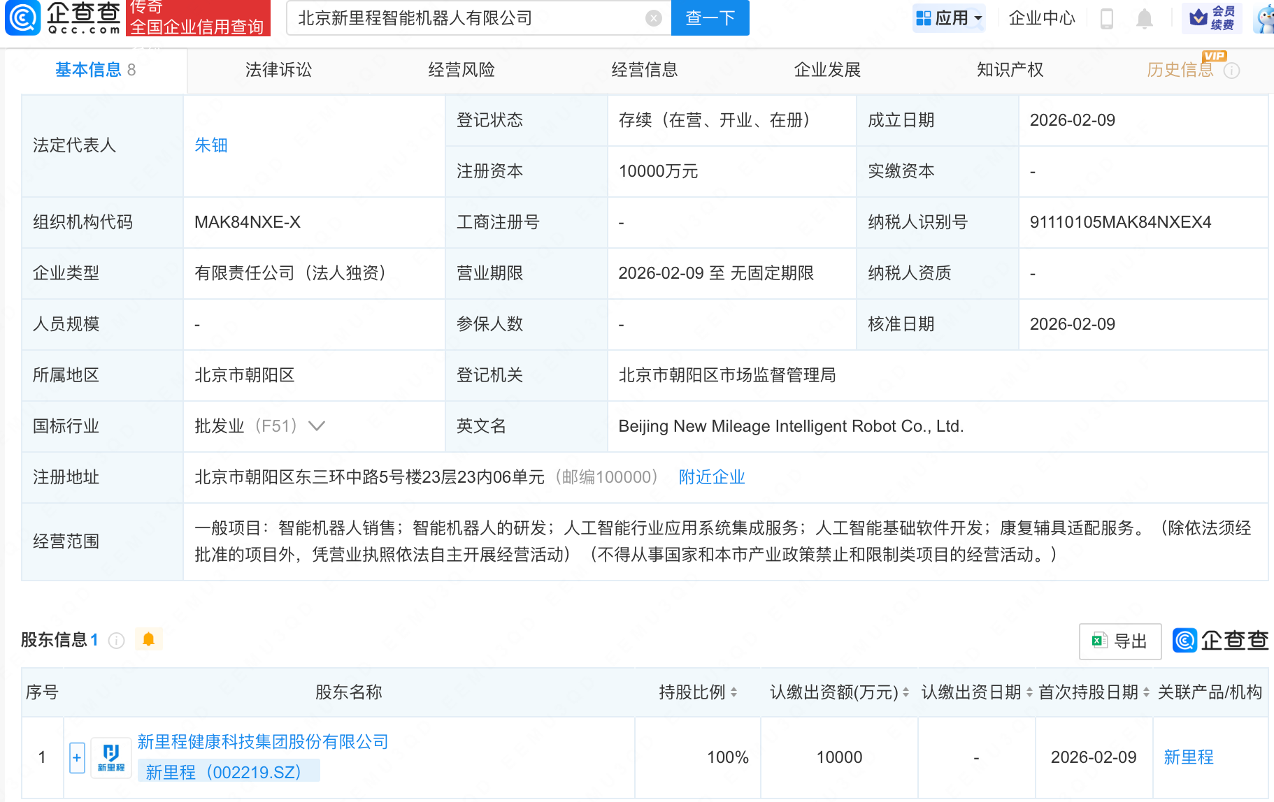 企查查APP显示,近日,北京新里程智能机器人有限公司成立,注册资本1亿元,经营范围包含:智能机器人销售;智能机器人的研发;人工智能行业应用系统集成服务;人工智能基础软件开发;康复辅具适配服务。企查查股权穿透显示,该公司由新里程(002219.SZ)全资持股。