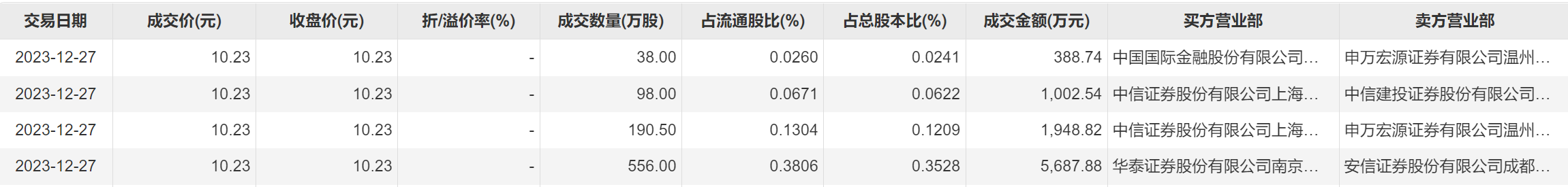 今日大宗交易成交882.5万股,成交额9027.98万元,占当日总成交额的70.89%,成交价10.23元,较市场收盘价持平。