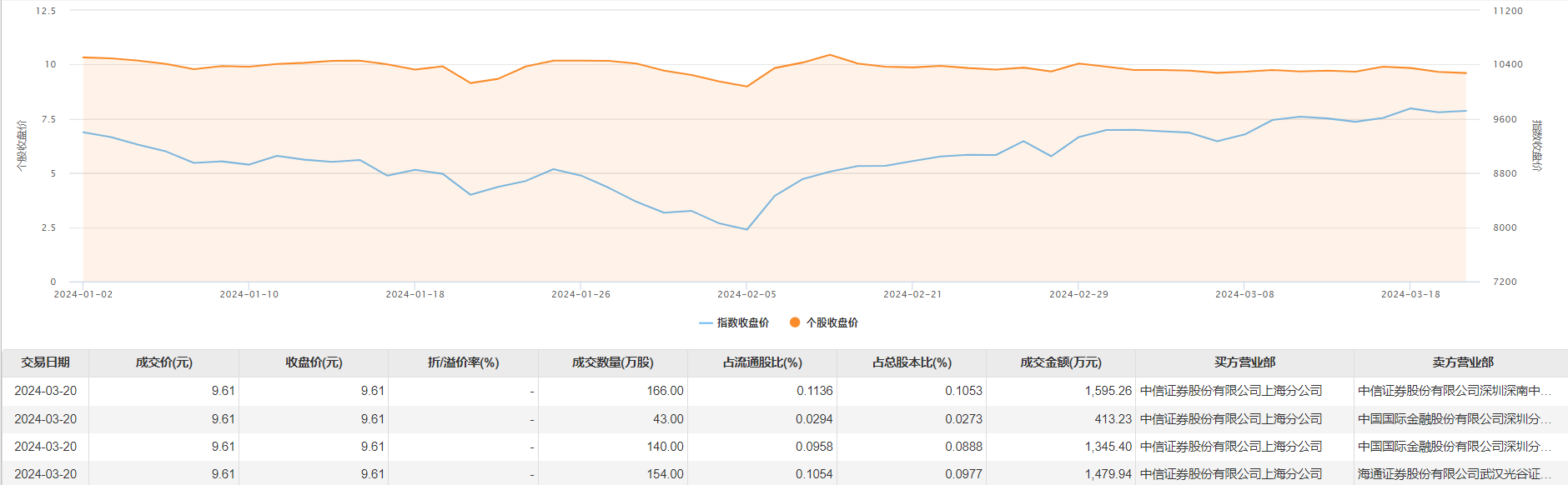 3月20日大宗交易成交503万股,成交额4833.83万元,占当日总成交额的50.75%,成交价9.61元,较市场收盘价9.61元持平。