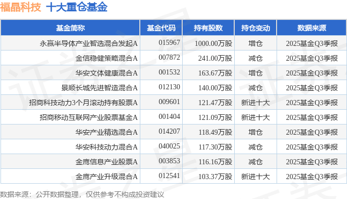 持有福晶科技最多的基金为永赢半导体产业智选混合发起A,目前规模为8.58亿元,最新净值1.7349(10月29日),较上一交易日上涨0.61%,近一年上涨78.62%。该基金现任基金经理为张海啸。