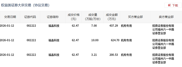 1月12日,福晶科技大宗交易成交20.21万股,成交额1262.52万元,占当日总成交额的0.36%,成交价62.47元,较市场收盘价72.12元折价13.38%。