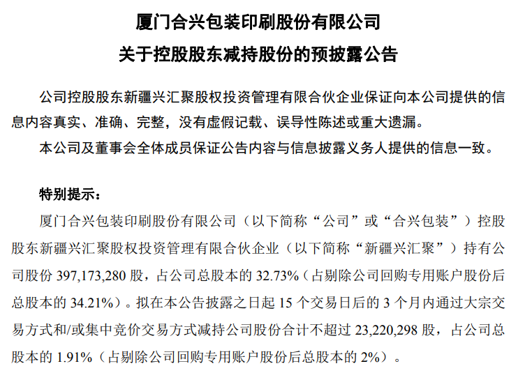 11月12日,合兴包装(002228.SZ)发布公告,公司控股股东新疆兴汇聚股权投资管理有限合伙企业(简称“新疆兴汇聚”)拟在公告披露之日起15个交易日后的3个月内通过大宗交易方式和/或集中竞价交易方式减持公司股份合计不超过2322.03万股,占公司总股本的1.91%(占剔除公司回购专用账户股份后总股本的2%)。