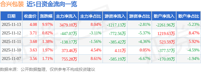 证券之星消息,合兴包装11月13日涨停收盘,收盘价4.08元。该股于13点18分涨停,未打开涨停,截止收盘封单资金为5938.66万元,占其流通市值1.2%。