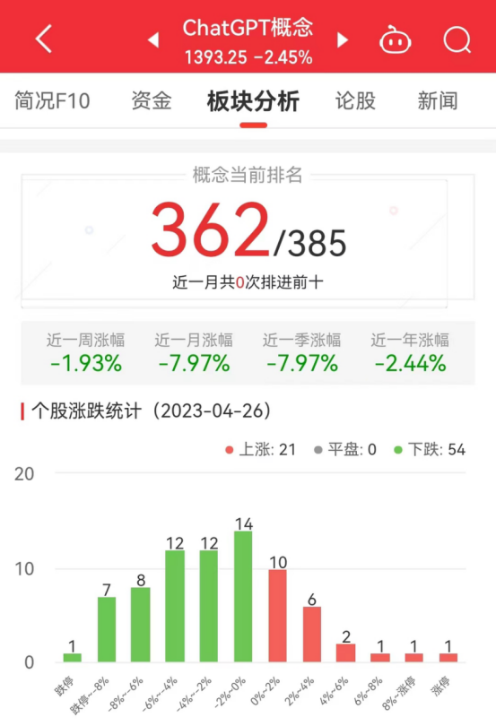 中国经济网北京4月26日讯今日,ChatGPT概念板块整体涨幅-2.45%,其中,21只股票上涨,0只股票平盘,54只股票下跌。