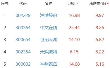 其中,鸿博股份、中文在线、世纪天鸿、天娱数科、神州泰岳位列板块涨幅前五位,涨幅分别为9.97%、8.26%、6.82%、6.22%、5.16%。
