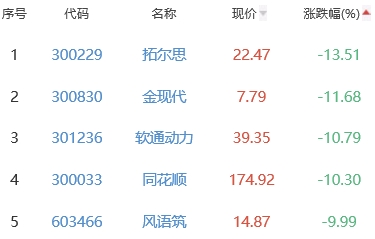 拓尔思、金现代、软通动力、同花顺、风语筑位列涨幅榜后五位,涨幅分别为-13.51%、-11.68%、-10.79%、-10.30%、-9.99%。