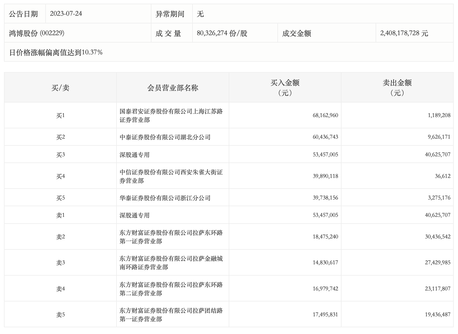 7月24日,鸿博股份今日涨停,龙虎榜数据显示,上榜营业部席位全天成交4.85亿元,占当日总成交金额比例为20.12%。其中,买入金额为3.29亿元,卖出金额为1.55亿元,合计净买入1.74亿元。