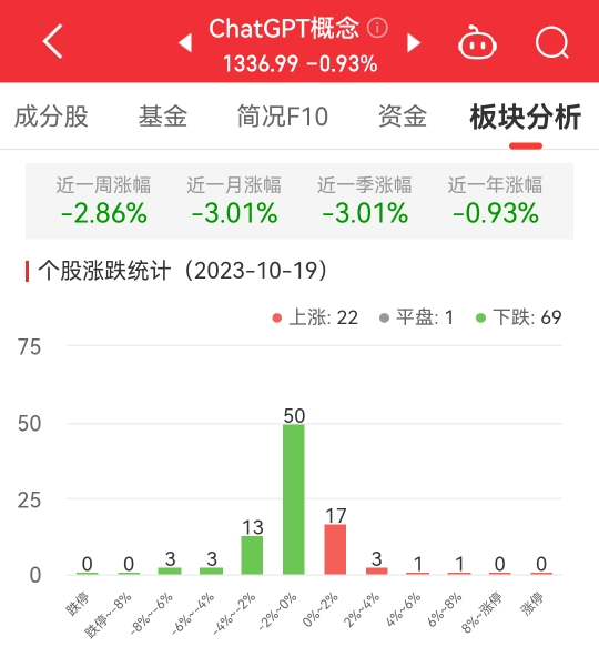 中国经济网北京10月19日讯今日,ChatGPT概念板块整体跌幅0.93%,其中22只股票上涨,1只股票平盘,69只股票下跌。
