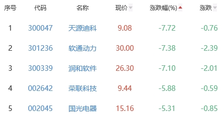 天源迪科、软通动力、润和软件、荣联科技(维权)、国光电器位列涨幅榜后五位,涨幅分别为-7.72%、-7.38%、-7.10%、-5.88%、-5.31%。
