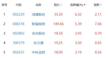 其中,鸿博股份、财富趋势、吉宏股份、东方通、中科金财位列板块涨幅前五位,涨幅分别为6.32%、5.39%、3.93%、3.50%、3.19%。