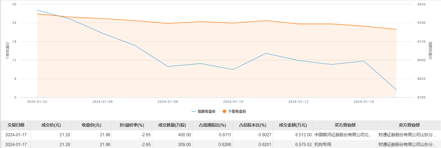 1月17日大宗交易成交709万股,成交额1.51亿元,占当日总成交额的14.99%,成交价21.28元,较市场收盘价折价2.65%。