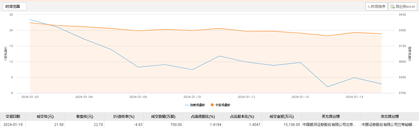 今日大宗交易成交700万股,成交额1.51亿元,占当日总成交额的13.8%,成交价21.58元,较市场收盘价折价4.93%。