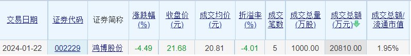 上证报中国证券网讯 据东方财富Choice数据,1月22日,鸿博股份大宗交易成交1000万股,成交额2.08亿元,占当日总成交额的21.91%,成交价20.81元,较市场收盘价折价4.01%。