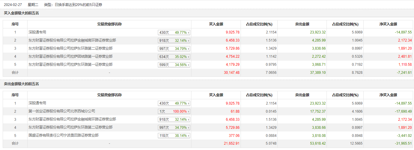 具体来看,知名游资现身龙虎榜,宁波桑田路(国盛证券有限责任公司宁波桑田路证券营业部)净卖出3441.02万元。此外,深股通专用、东方财富证券拉萨金融城南环路证券营业部分别买入9025.78万元、6458.33万元;深股通专用、第一创业证券北京西城分公司分别卖出2.39亿元、1.78亿元。