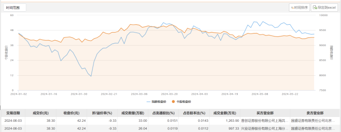 今日大宗交易成交59.04万股,成交额2261.23万元,占当日总成交额的3.1%,成交价38.3元,较市场收盘价折价9.33%。