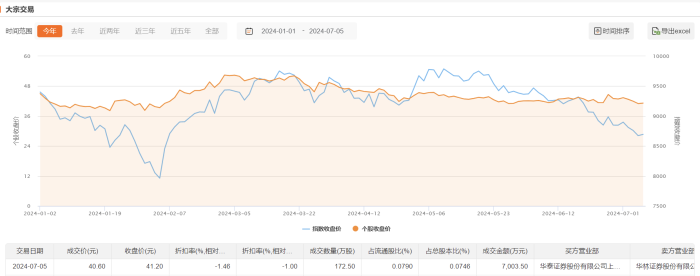 今日大宗交易成交172.5万股,成交额7003.5万元,占当日总成交额的6.87%,成交价40.6元,较市场收盘价折价1.46%。