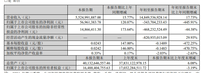 - 第三季度利润:5696万元,同比增长120.87%;前三季度利润亏损3.437亿元,同比下降445.91%。