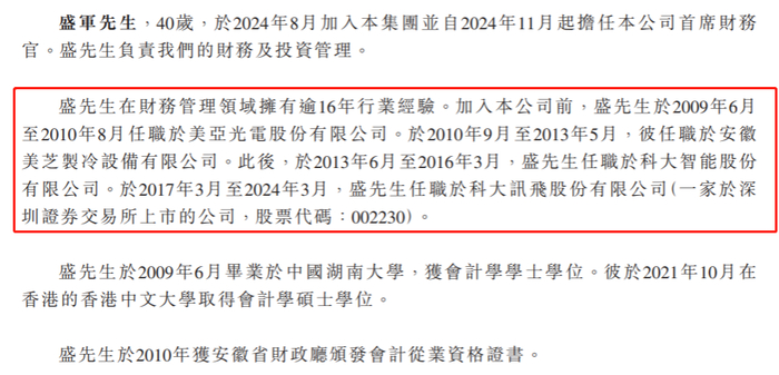 盛军,40岁,于2024年8月加入集团并自2024年11月起担任公司首席财务官,负责公司的财务及投资管理。