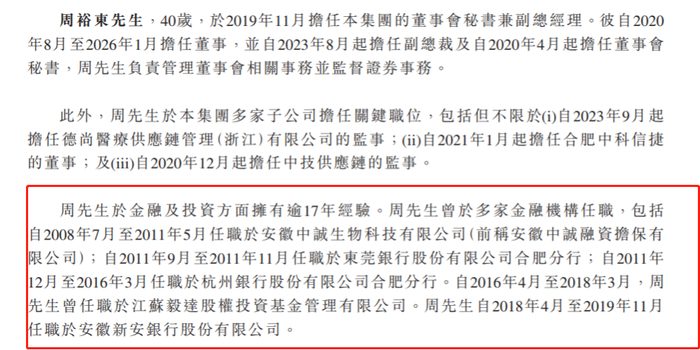 周裕东于金融及投资方面拥有逾17年经验。他曾于多家金融机构任职,包括自2008年7月至2011年5月任职于安徽中诚生物科技有限公司(前称安徽中诚融资担保有限公司);自2011年9月至2011年11月任职于东莞银行股份有限公司合肥分行;自2011年12月至2016年3月任职于杭州银行股份有限公司合肥分行。自2016年4月至2018年3月,曾任职于江苏毅达股权投资基金管理;自2018年4月至2019年11月任职于安徽新安银行股份有限公司。