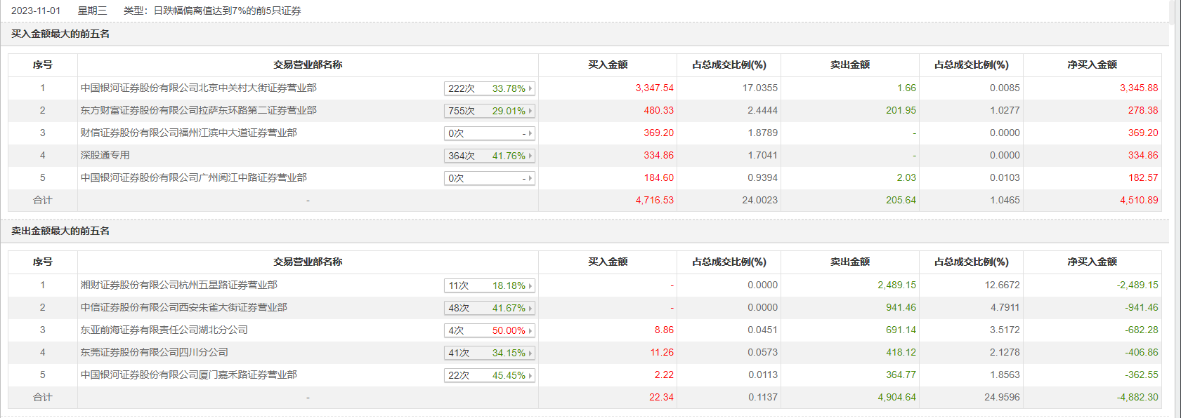 11月1日,启明信息今日跌停,龙虎榜数据显示,上榜营业部席位全天成交9849.15万元,占当日总成交金额比例为50.12%。其中,买入金额为4738.87万元,卖出金额为5110.28万元,合计净卖出371.42万元。