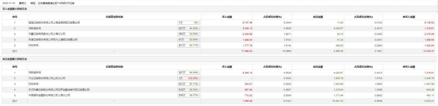 11月15日,启明信息今日涨停,全天换手率达14.68%,振幅达10.96%。龙虎榜数据显示,营业部席位合计净买入8689.75万元。其中,机构买入2121.07万元,卖出2177.73万元,合计净卖出56.66万元。此外,国信证券上海淮海西路证券营业部、深股通专用分别买入6157.46万元、5345.18万元;深股通专用、兴业证券山东分公司分别卖出4028.67万元、1843.76万元。