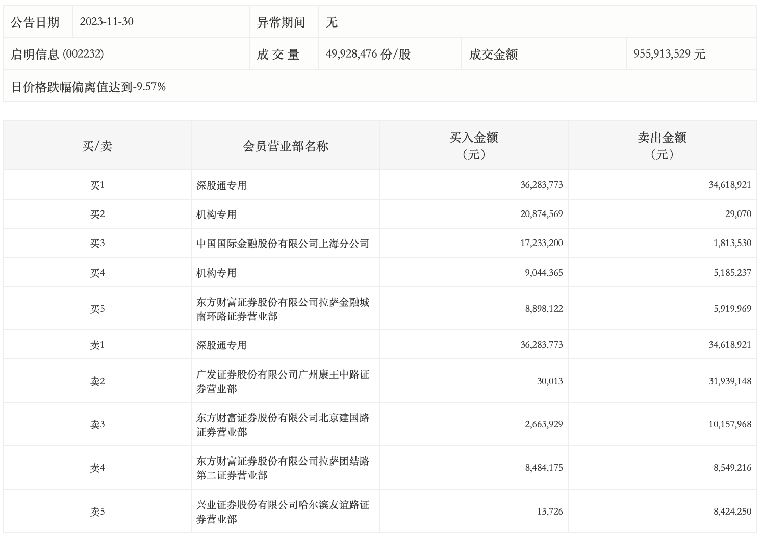 11月30日,启明信息今日跌9.92%,全天换手率达12.22%,振幅达7.97%。龙虎榜数据显示,营业部席位合计净卖出311.14万元。其中,机构买入2991.89万元,卖出521.43万元,合计净买入2470.46万元。此外,深股通专用、广发证券广州康王中路证券营业部分别卖出3461.89万元、3193.91万元;深股通专用、中国国际金融上海分公司分别买入3628.38万元、1723.32万元。