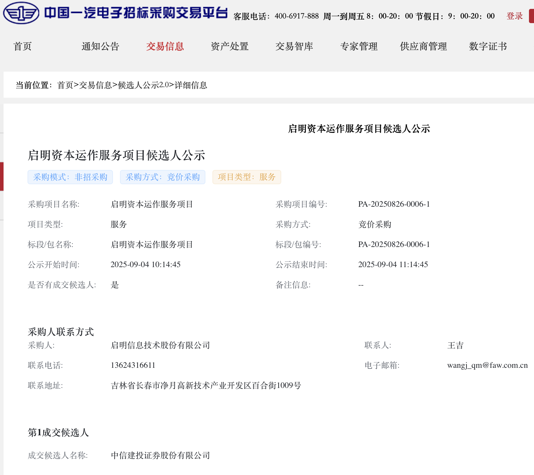 人民财讯9月5日电,9月4日,中国一汽电子招标采购交易平台发布《启明资本运作服务项目候选人公示》。采购人为