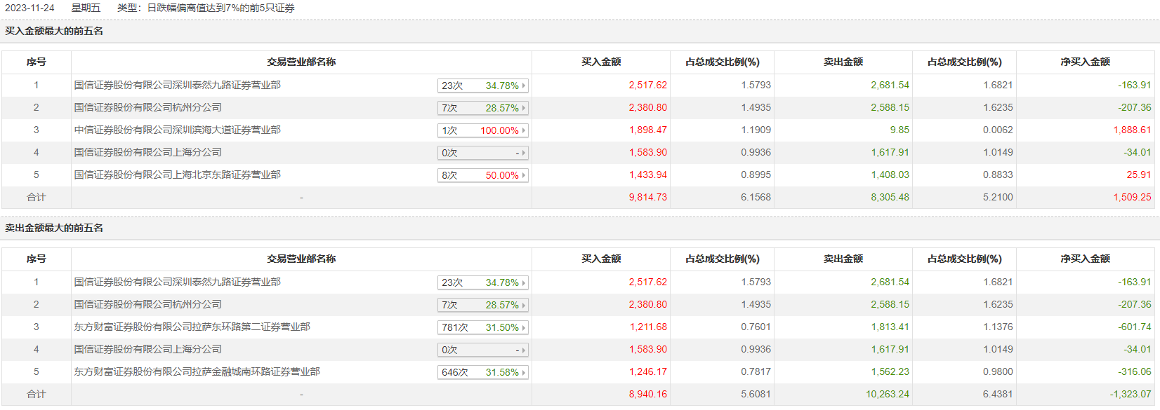 其中,国信证券深圳泰然九路证券营业部、国信证券杭州分公司分别卖出2681.54万元、2588.15万元;国信证券深圳泰然九路证券营业部、国信证券杭州分公司分别买入2517.62万元、2380.80万元。