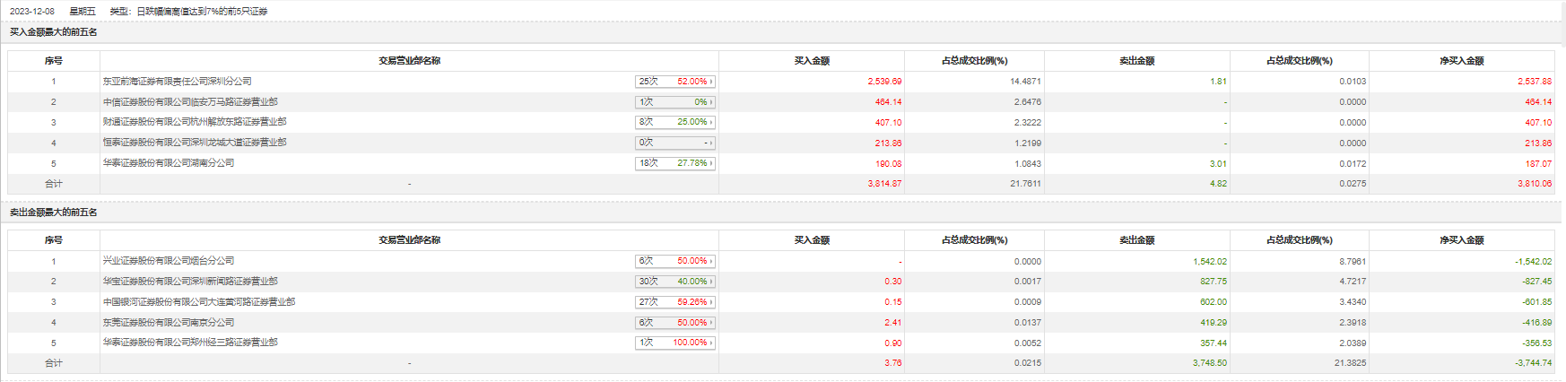 12月8日,天威视讯今日跌停,全天换手率达1.45%,振幅达0%。龙虎榜数据显示,营业部席位合计净买入65.32万元。其中,兴业证券烟台分公司、华宝证券深圳新闻路证券营业部分别卖出1542.02万元、827.75万元;东亚前海证券深圳分公司、中信证券临安万马路证券营业部分别买入2539.69万元、464.14万元。