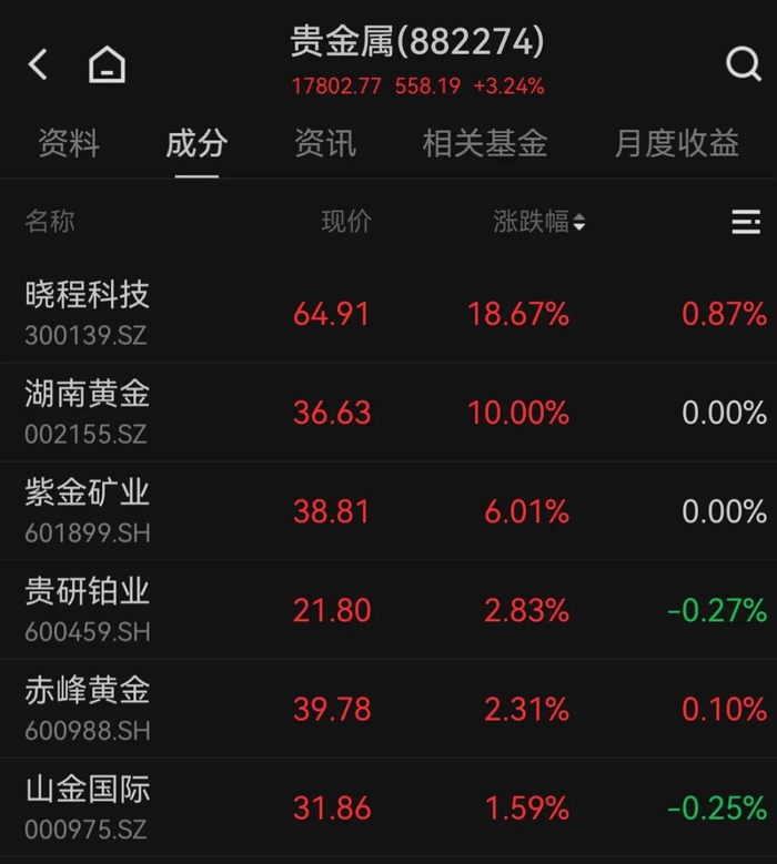 午后,贵金属概念局部反弹,湖南黄金尾盘涨停,走出7天6板。此外,晓程科技涨超18%,紫金矿业涨超6%。