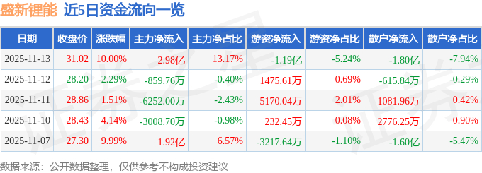 证券之星消息,盛新锂能11月13日涨停收盘,收盘价31.02元。该股于10点37分涨停,未打开涨停,截止收盘封单资金为6165.46万元,占其流通市值0.23%。