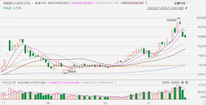 格隆汇11月24日|A股市场锂矿股今日再度集体回调,为连续第三日回调。其中,融捷股份、大为股份、国城矿业、盛新锂能跌停,金圆股份逼近跌停,江特电机、西藏珠峰、大中矿业跌超8%,雅化集团跌超7%,赣锋锂业、天齐锂业、西藏矿业、川能动力跌超6%,海南矿业跌超5%。消息面上,碳酸锂主力合约在此前持续大涨后高位回调,今日盘中跌超2%,为连续第二日回调。