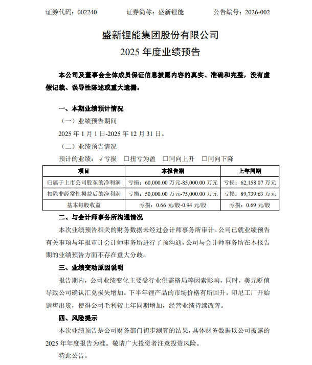 盛新锂能:2025年预计净亏损6亿元-8.5亿元,业绩继续亏损