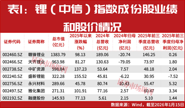 Wind显示,锂(中信)指数的7只成分股在2025年至2026年1月13日期间股价表现强劲,涨幅区间为52.8%-172%。其中,盛新锂能(002240.SZ)领涨,区间涨幅达172%,其次是中矿资源(002738.SZ)、雅化集团(002497.SZ),涨幅分别为155.3%和109%,赣锋锂业(002460.SZ)、天齐锂业(002466.SZ)紧随其后,涨幅排在末位的融捷股份(002192.SZ)、永兴材料(002756.SZ)去年以来涨幅也分别有84.7%、52.8%。股价走势高低反映了二级市场投资者,特别是机构投资者对相关公司业绩和资产价值的不同判断。