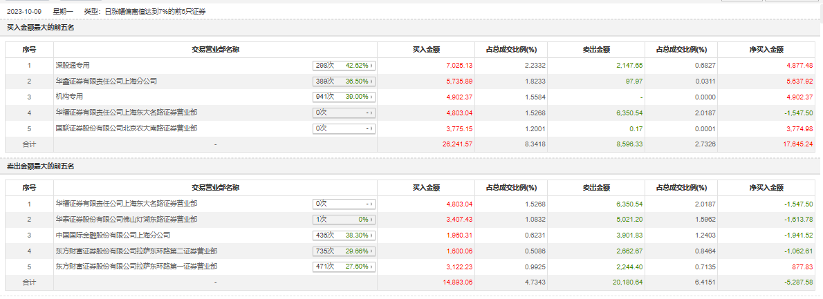具体来看,机构合计净买入4902.37万元。此外,深股通专用、华鑫证券上海分公司分别买入7025.13万元、5735.89万元;华福证券上海东大名路证券营业部、华泰证券佛山灯湖东路证券营业部分别卖出6350.54万元、5021.20万元。