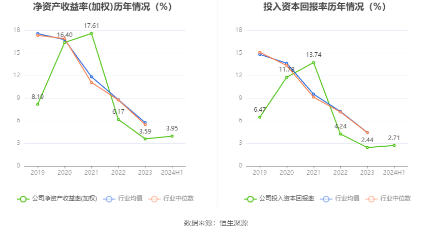 数据显示,2024年上半年公司加权平均净资产收益率为3.95%,较上年同期增长2.55个百分点;公司2024年上半年投入资本回报率为2.71%,较上年同期增长1.97个百分点。
