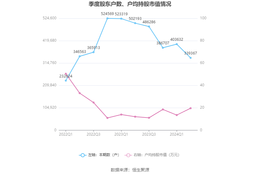 筹码集中度方面,截至2024年上半年末,公司股东总户数为33.94万户,较一季度末下降了6.43万户,降幅15.92%;户均持股市值由一季度末的13.53万元上升至19.64万元,增幅为45.16%。