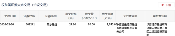 2月26日,歌尔股份大宗交易成交70万股,成交额1743万元,占当日总成交额的0.7%,成交价24.9元,较市场收盘价27.08元折价8.05%。