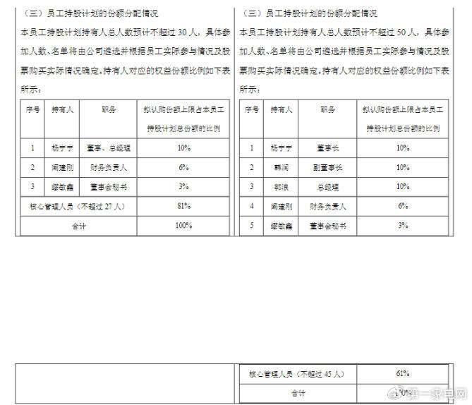 九阳股份第一期员工持股计划的参与者只有公司高管和核心管理人员,包括董事长、副董事长、总经理、财务负责人、董事会秘书等,并且中途进行过变更,参与人数由最多不超过27人调整为最多不超过45人。