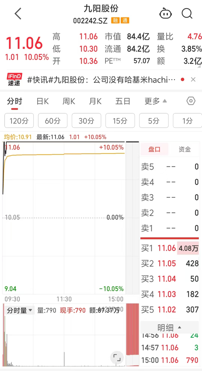 九阳股份涨停后回应:公司没有哈基米相关的产品
