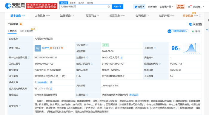 天眼查工商信息显示,九阳股份有限公司成立于2002年7月,法定代表人为杨宁宁,注册资本约7.6亿人民币,经营范围含家用电器研发、家用电器制造、家用电器销售等。股东信息显示,该公司由上海力鸿企业管理有限公司、中央汇金资产管理有限责任公司、香港中央结算有限公司等共同持股。