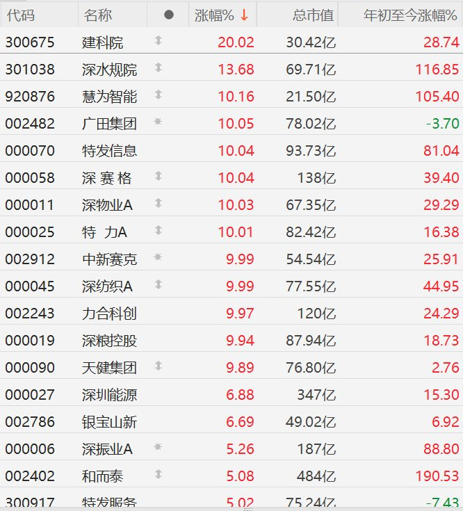 格隆汇10月23日|A股市场深圳本地股集体走强,其中,建科院20CM涨停,深水规院涨超13%,广田集团、特发信息、深赛格、深物业A、特力A、中新赛克、深纺织A、力合科创、深粮控股10CM涨停,天健集团逼近涨停,深圳能源、银宝山新涨超6%,深振业A、和而泰、特发服务涨超5%。