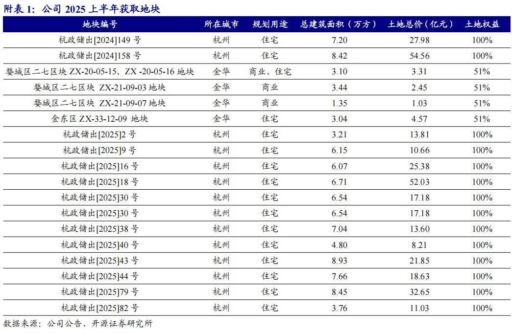公司2025上半年实现销售金额527.5亿元,同比-9.4%,行业销售排名第十,民企排名第一。根据克而瑞数据,公司上半年在杭州全口径销售额287亿元,市占率维持第一。公司上半年在杭州和金华拿地16宗,总土地款333亿元,新增货值超542亿元,拿地强度达63%;其中在杭州拿地金额超307亿元,新增土储超84万方。截至2024年末,公司土储建面997.6万方,其中杭州占比70%,土储结构优质。