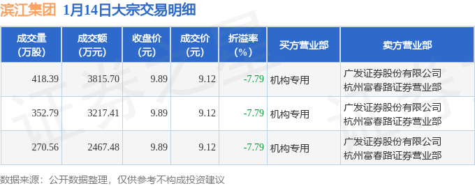 1月14日滨江集团现3笔大宗交易 机构净买入9500.59万元